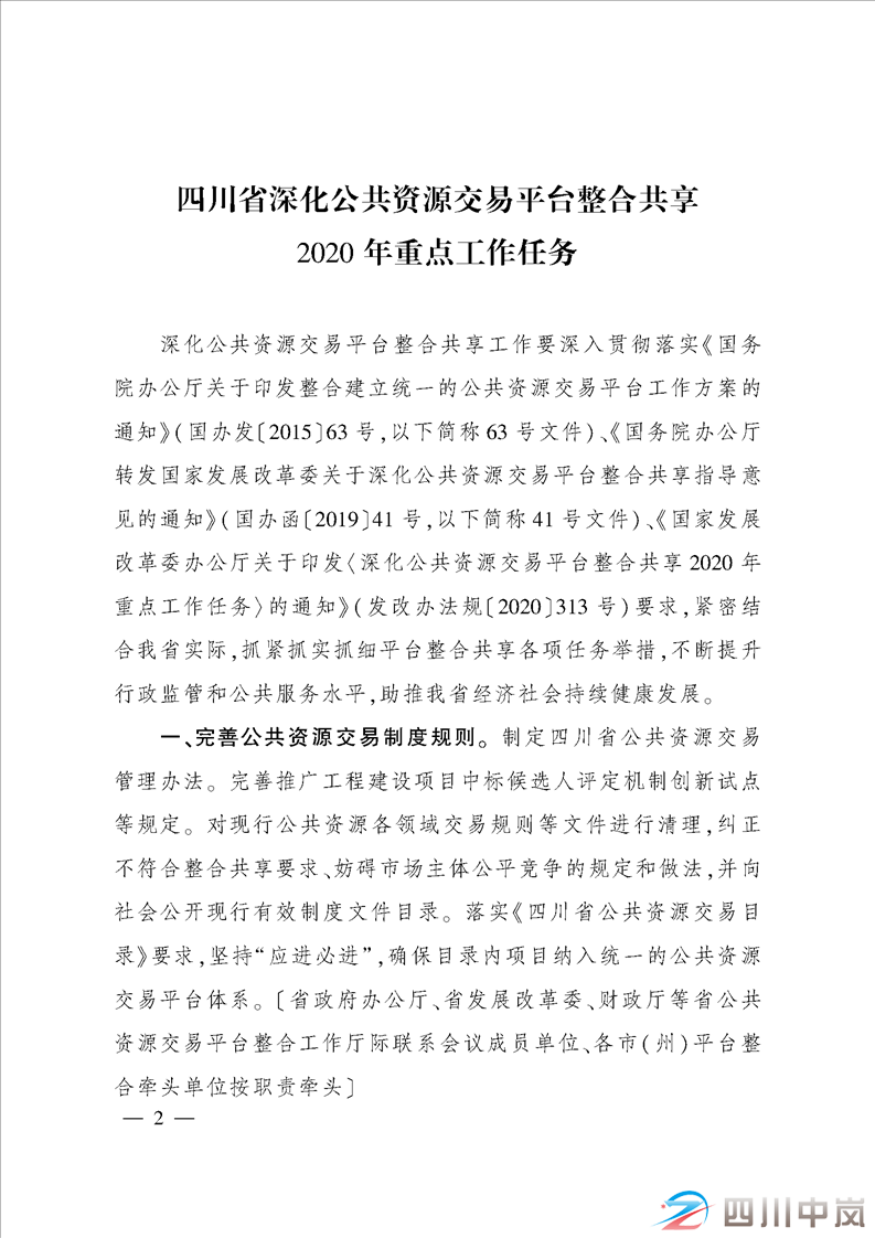 四川省人民政府辦公廳關(guān)于印發(fā)《四川省深化公共資源交易平臺整合共享2020年重點工作任務(wù)》的通知